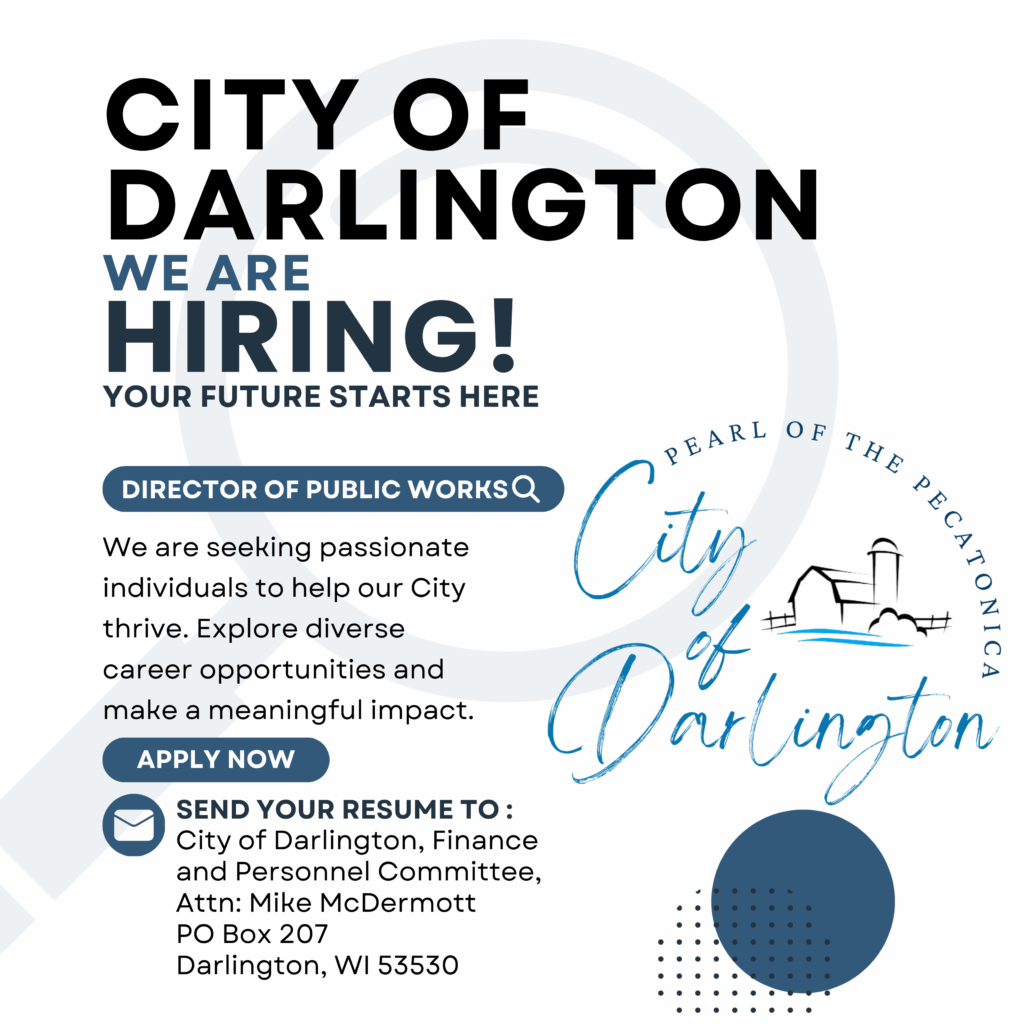 Application form and a complete position description are available at the City Office at 627 Main Street, Darlington, WI 53530; or by calling (608) 776-4970. This same information can be found on the City’s website: www.darlingtonwi.org under Current Job Advertisements. Submit completed application form and resume to: City of Darlington, Finance and Personnel Committee, Attn: Mayor Mike McDermott, P.O. Box 207, Darlington, WI 53530. Application deadline is Friday, November 14, 2025, at 10:00 AM.