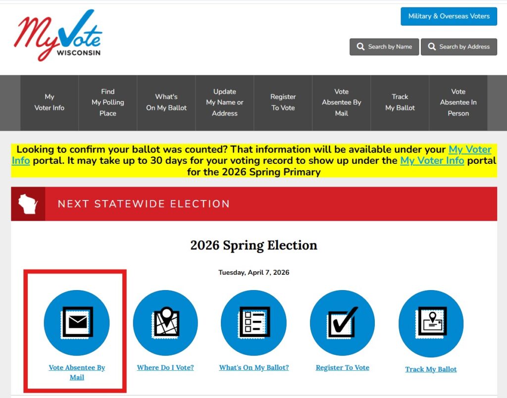 If you are already registered to vote, you can request an Absentee Ballot online at: https://myvote.wi.gov/en-us/
